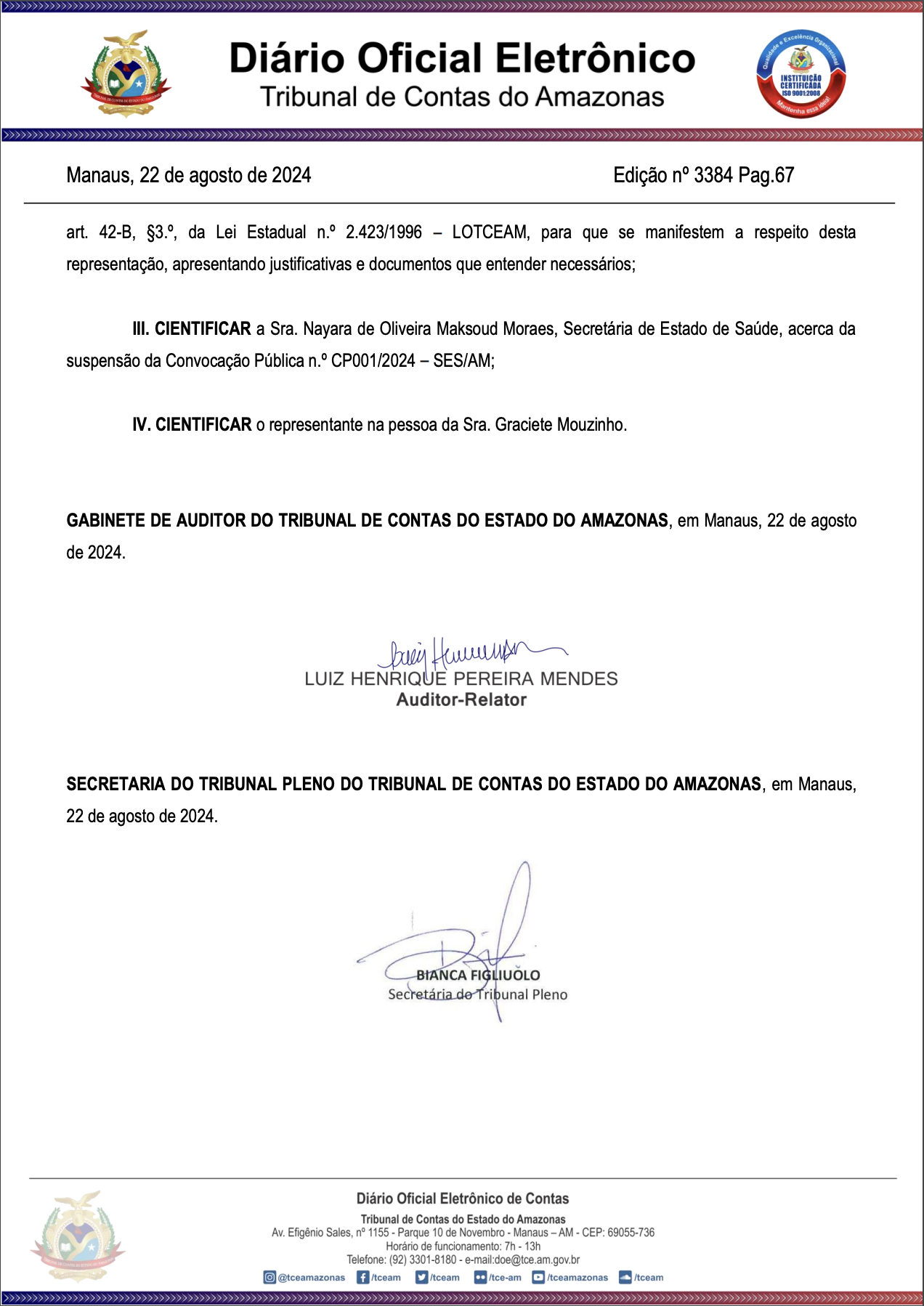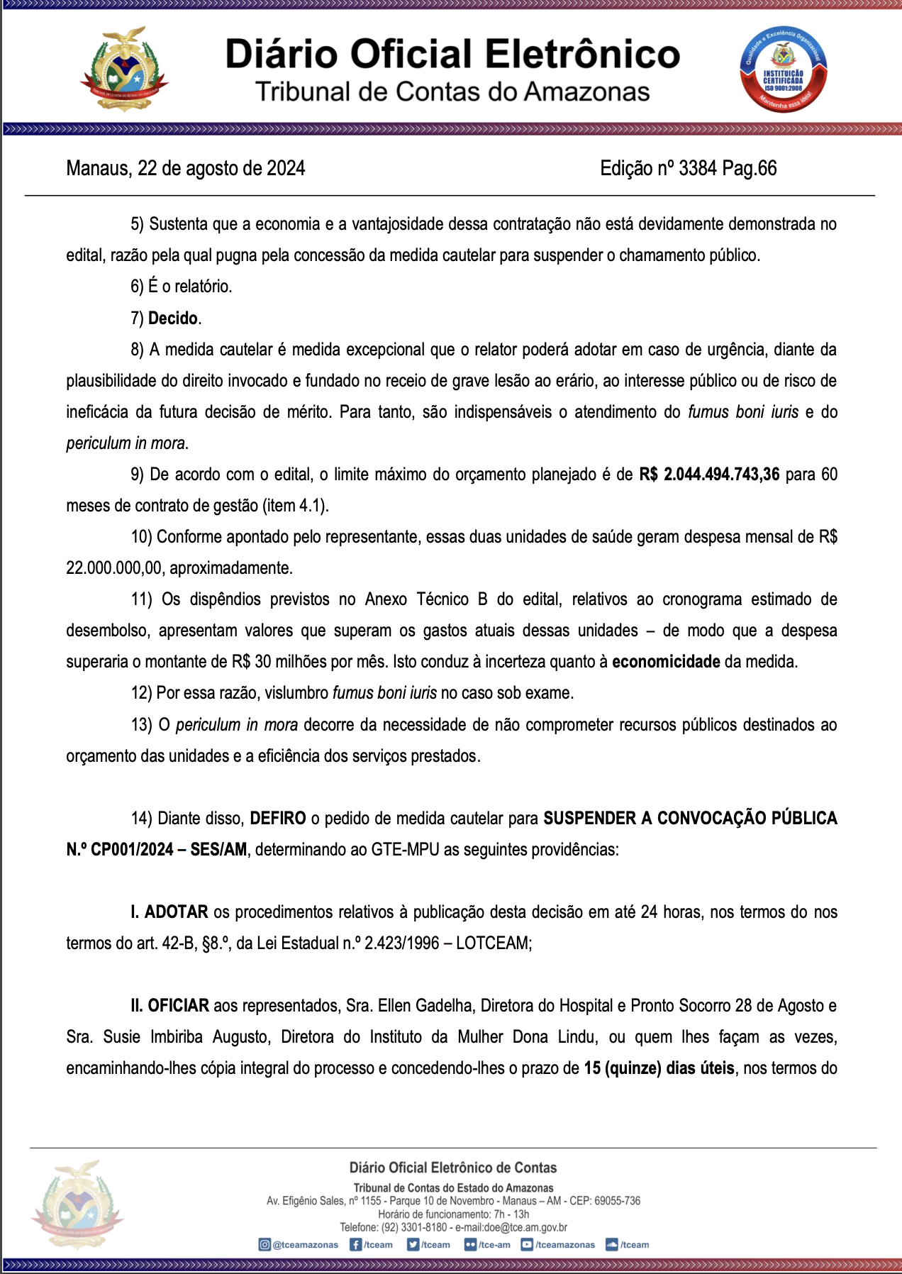 Com essa decisão, o TCE-AM determinou a suspensão imediata do edital e a notificação das partes envolvidas para que apresentem suas justificativas e documentos no prazo de 15 dias úteis. A decisão deverá ser publicada no Diário Oficial Eletrônico de Contas dentro de 24 horas.