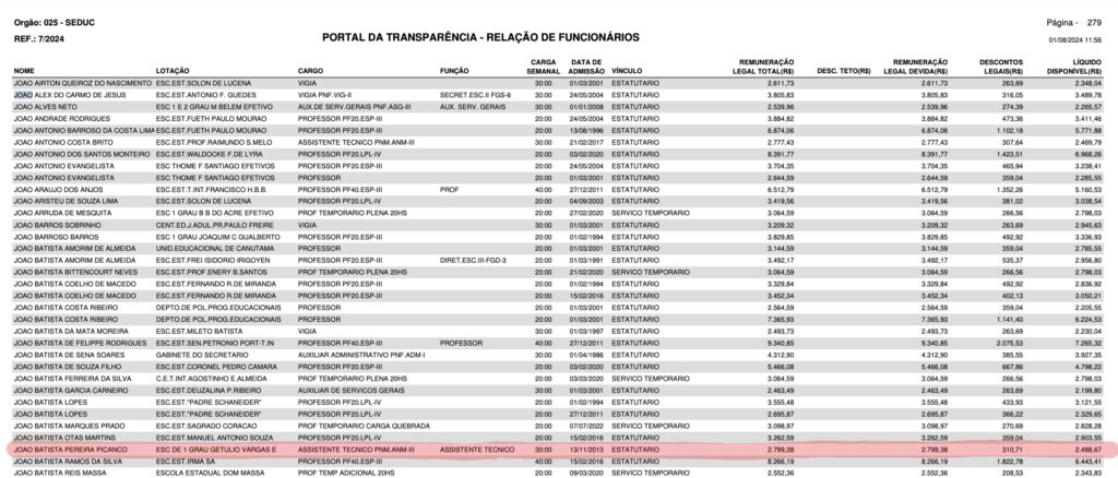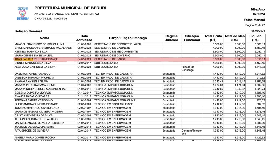 O marido da candidata, João Batista Pereira Picanço, ocupa dois cargos: Secretário Municipal de Saúde de Beruri, com um salário bruto de R$ 6.500,00, e Assistente Técnico da Secretaria de Educação e Desporto Escolar (SEDUC-AM), recebendo R$ 2.799,38, apesar de não exercer efetivamente o cargo.