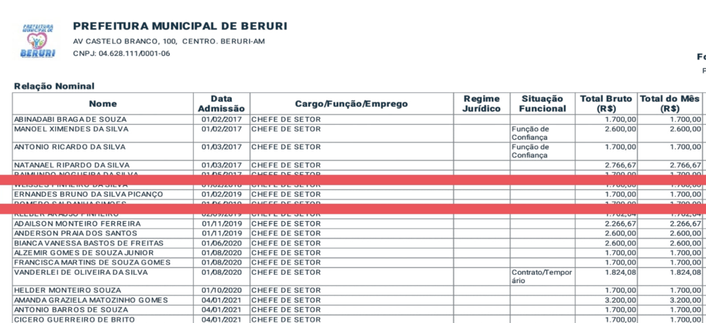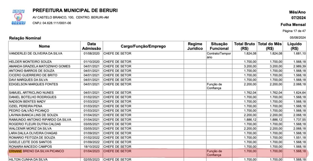 O filho do casal, Ernane Breno da Silva Picanço, recebe R$ 1.700,00 como Chefe de Setor da Prefeitura Municipal de Beruri e cerca de R$ 1.430,00 como Agente de Portaria na Escola Estadual Getúlio Vargas.
