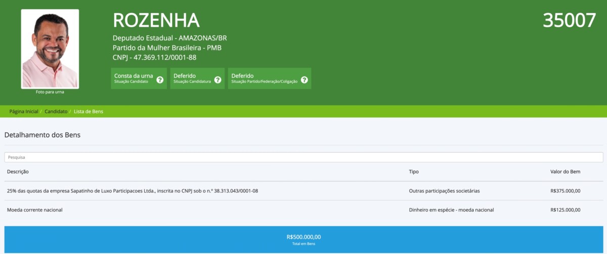 Vale ressaltar que Rozenha declarou ter R$ 500 mil de patrimônio mesmo só andando em carros de luxo, como seu carro Rand Rover e a histórica CG 125 da Honda, primeira moto fabricada no Amazonas, bem como sua loja, a Sapatinho de Luxo, presente em vários shoppings de Manaus e outras cidades na região norte e nordeste do país. A ostentação do empresário e da sua marca supostamente não condiz com a o que ela declara ter à Justiça Eleitoral, tendo em vista que recentemente o mesmo estrelou uma coleção nova em Dubai e contratou uma das maiores influenciadoras brasileiras para ser embaixadora, a Gkay.