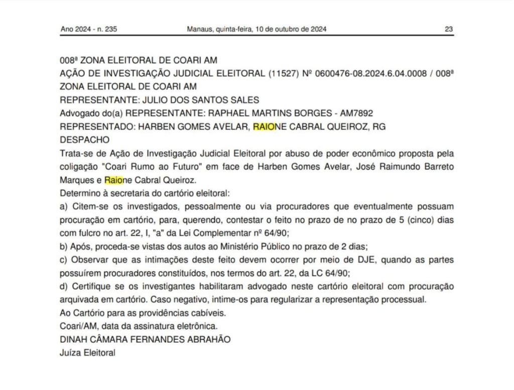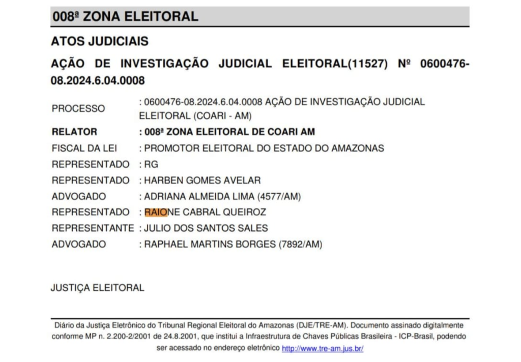 Amazonas – Os candidatos à Prefeitura de Coari, Harben Avelar e Raione Cabral, são investigados pela Justiça Eleitoral. Ambos saíram derrotados nas urnas coarienses, com 47,78% e 0,15%, respectivamente.