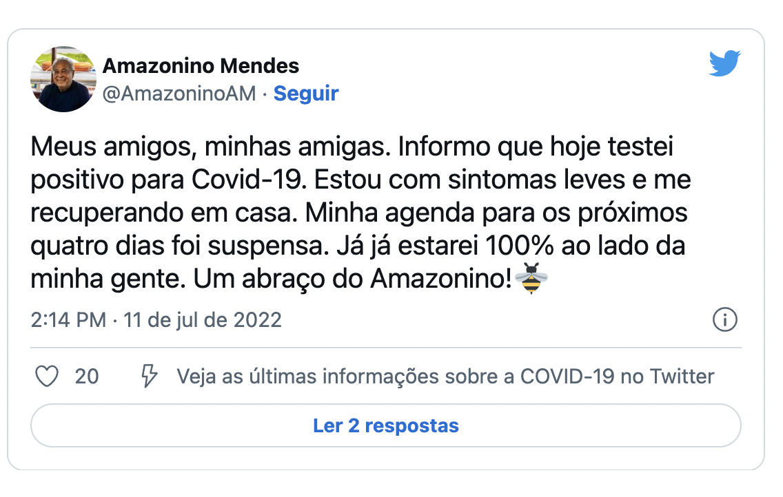 Amazonas – O pré-candidato ao Governo do Amazonas, Amazonino Mendes (Cidadania), de 82 anos, confirmou nesta segunda-feira (11), que testou positivo para Covid-19. Essa é a segunda vez que o político testa para a doença.