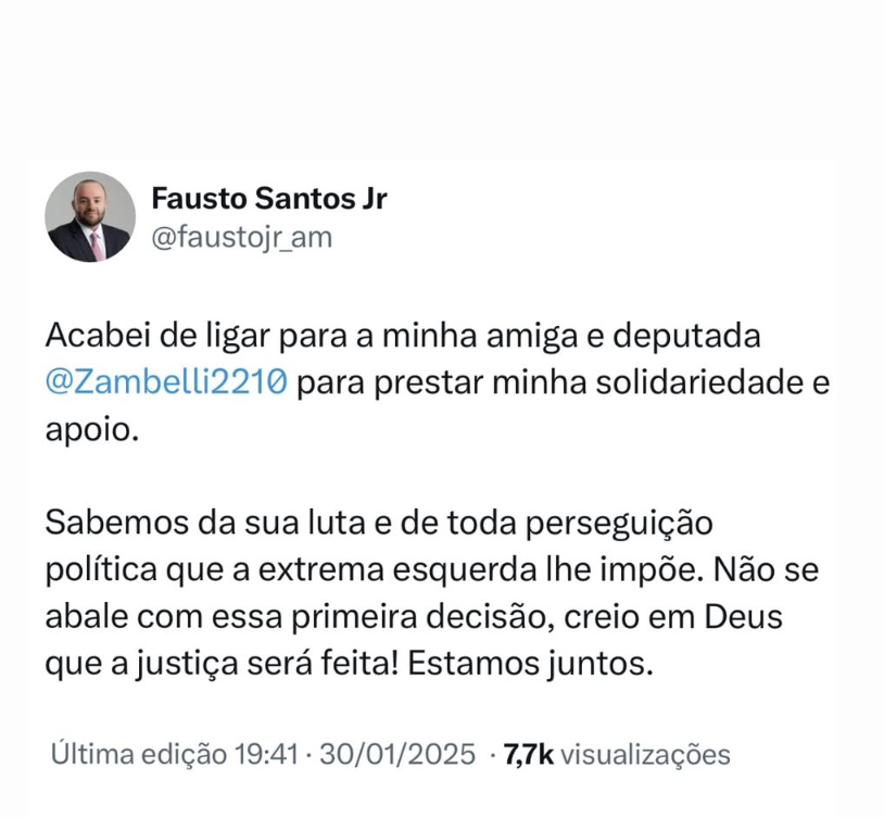 “Acabei de ligar para a minha amiga e deputada @Zambelli2210 para prestar minha solidariedade e apoio. Sabemos da sua luta e de toda perseguição política que a extrema esquerda lhe impõe. Não se abale com essa primeira decisão, creio em Deus que a justiça será feita! Estamos juntos.”