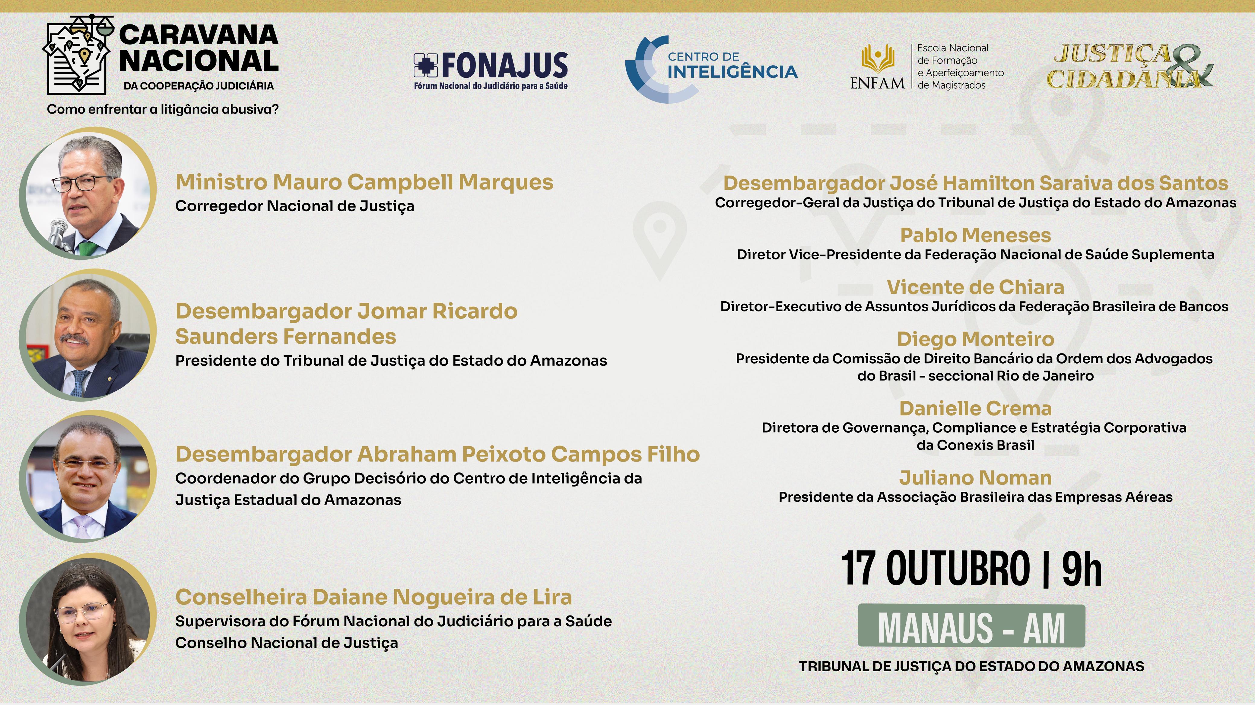 O evento contará com a presença de autoridades como o corregedor nacional de Justiça, ministro Mauro Campbell Marques; o presidente do TJAM, desembargador Jomar Ricardo Saunders; o corregedor-geral de Justiça do TJAM, desembargador José Hamilton Saraiva; o coordenador do Grupo Decisório do Centro de Inteligência do TJAM, desembargador Abraham Peixoto Campos Filho; e a supervisora do Fonajus, conselheira Daiane de Lira (CNJ), entre outros magistrados e especialistas.