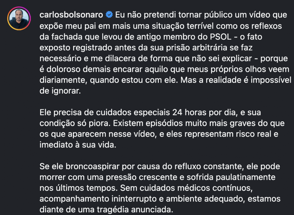 No texto que acompanha o vídeo, Carlos afirma que Jair Bolsonaro necessita de “cuidados especiais 24 horas por dia” e que há episódios “muito mais graves” do que os mostrados na gravação, representando “risco real e imediato à sua vida”. Ele menciona refluxo intenso e o perigo de broncoaspiração: “Se ele broncoaspirar por causa do refluxo constante, vai morrer. Sem cuidados médicos contínuos, acompanhamento ininterrupto e ambiente adequado, estamos diante de uma tragédia anunciada.”