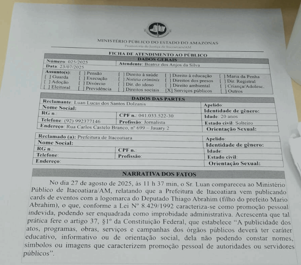 A denúncia foi registrada às 11h37 por um cidadão identificado como Luan Lucas do Santos Dolzane, que compareceu presencialmente à sede do MP-AM no município de Itacoatiara.