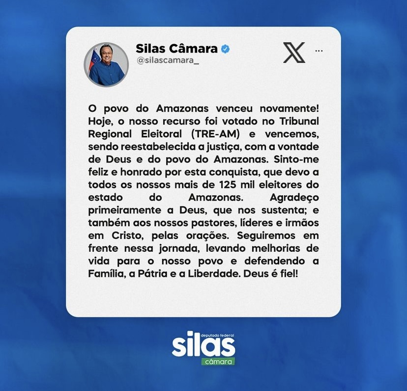 Em suas redes sociais, Silas Câmara expressou sua felicidade e gratidão pela conquista, atribuindo-a não apenas aos mais de 125 mil eleitores do estado do Amazonas, mas também à fé e apoio de lideranças religiosas e irmãos em Cristo.