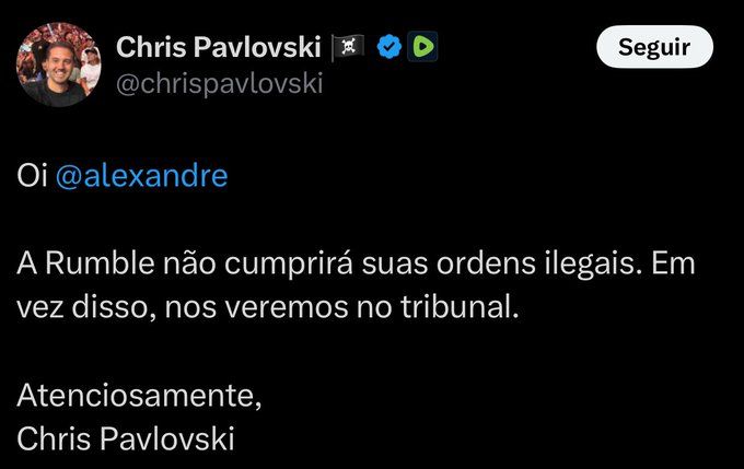 – Oi, Alexandre [de Moraes]. A Rumble não cumprirá suas ordens ilegais. Em vez disso, nos veremos no tribunal. Atenciosamente, Chris Pavlovski – escreveu.