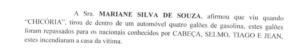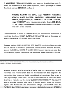 Ela alegou que testemunhou quando indivíduos identificados como Janelson Laranjeiras dos Santos, vulgo “Cabeça, Antônio Martins da Silva, vulgo “Selmo, Francisco de Souza Oliveira, vulgo “Chicória, e outros indivíduos não identificados, jogaram combustível na residência e a incendiaram. Ela fugiu com seus filhos para a rua, escapando do fogo.