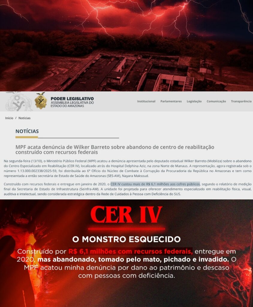 As imagens trazem à tona o Centro Especializado em Reabilitação (CER IV), localizado atrás do Hospital Delphina Aziz. Construído com R$ 6,1 milhões de recursos federais e entregue em 2020, o local encontra-se, segundo as fotos e a denúncia, “tomado pelo mato, pichado e invadido”. O Ministério Público Federal (MPF) acatou a denúncia de Barreto por dano ao patrimônio, evidenciando o descaso com uma estrutura vital para pessoas com deficiência.