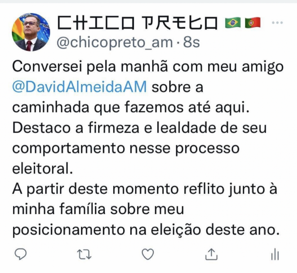 Amazonas – Chico Preto, ex-vereador de Manaus, publicou uma mensagem misteriosa em suas redes sociais ao qual muitos interpretaram como “desistência” ao senado. O motivo é que pelo arco de aliança formado pelos partidos Avante, União Brasil e PL, em torno do governador Wilson Lima, apenas um candidato ao senado terá sua candidatura majoritariamente apoiada, sendo este Coronel Menezes (PL).