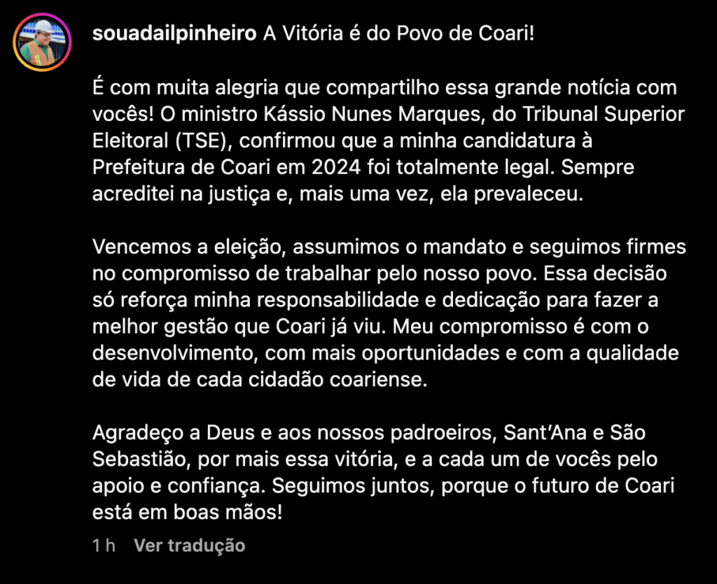 Brasil – A atuação dos advogados Sanderson Mafra e Gina Moraes de Almeida no Tribunal Superior Eleitoral (TSE), em Brasília (DF), foi decisiva para a manutenção de Adail Pinheiro no cargo de prefeito de Coari. Isso porque o ministro Nunes Marques, do TSE, indeferiu, na última terça-feira (25/03), todos os recursos, interpostos pelo Ministério Público Eleitoral (MPE) e pelos candidatos Harben Avelar e Raione Cabral, contra a elegibilidade do gestor no pleito de 2024.