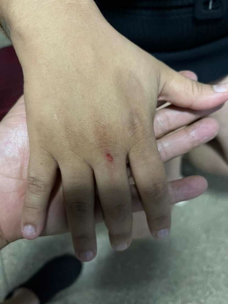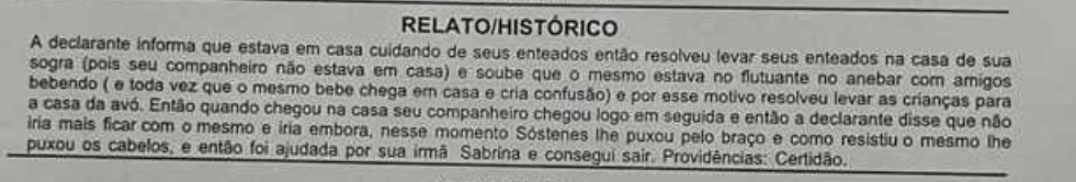 A ação foi testemunhada pela irmã de Saline, Sabrina, e a denunciante só conseguiu sair da casa com a ajuda da familiar. Veja trecho da denúncia: Em imagens, é possível ver as escoriações causadas pela agressão cometida contra a vítima.