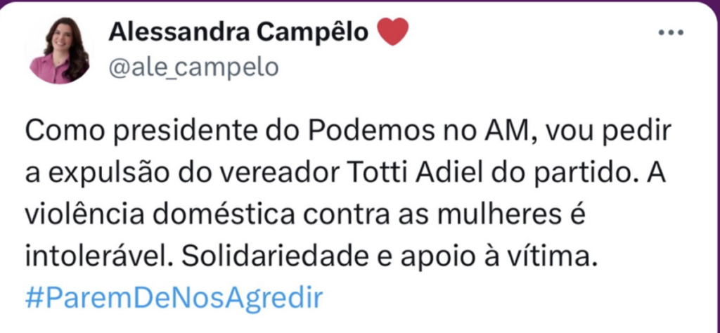 Amazonas – O vereador Totti Adiel, acusado de agressão física contra a própria esposa, segue trabalhando normalmente na Câmara Municipal de Itacoatiara como se nada tivesse acontecido. Durante sessão no parlamento municipal realizando desta segunda-feira (8/4), o vereador relevou ter conseguido se filiar ao União Brasil (UB) com ajuda do filho do prefeito, o deputado estadual Thiago Abrahim, que articulou sua ida para a sigla.