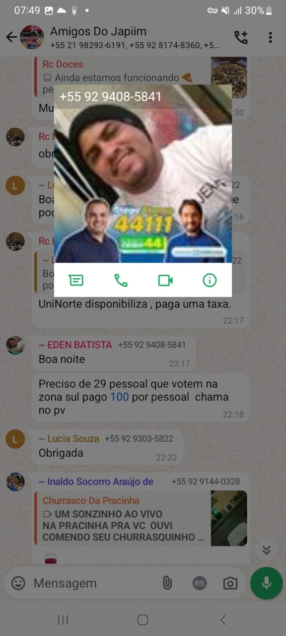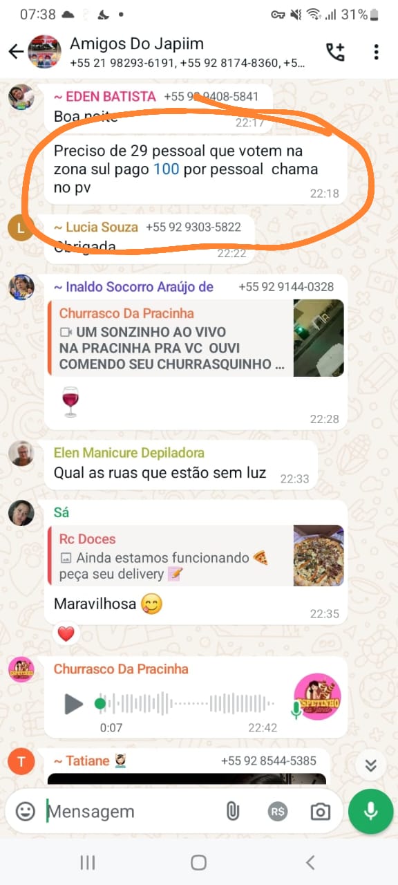 Em um grupo chamado “Amigos do Japiim”, Eden teria enviado mensagens prometendo dinheiro em troca de votos para 29 pessoas que residem na zona sul da capital amazonense. A ação foi registrada em prints pelas pessoas no grupo. Além das mensagens escritas, áudios gravados pelo cabo eleitoral detalham a operação ilegal enviado em mensagens privadas aos alvos do grupo, que incluía a exigência de participação em reuniões e a apresentação do comprovante de votação.
