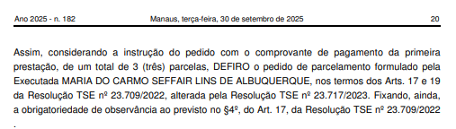 Manaus – O Tribunal Regional Eleitoral do Amazonas (TRE-AM) autorizou o parcelamento de uma dívida solicitado por Maria do Carmo Sefair, ex-candidata à vice-prefeitura de Manaus. A decisão foi publicada no Diário da Justiça Eletrônico nesta terça-feira (30). A ex-candidata, que integrou a Coligação Ordem e Progresso, foi condenada pela Justiça Eleitoral por abuso da liberdade de expressão durante o pleito de 2024.