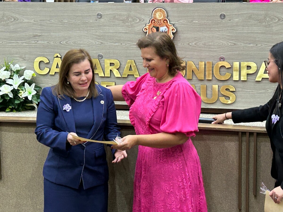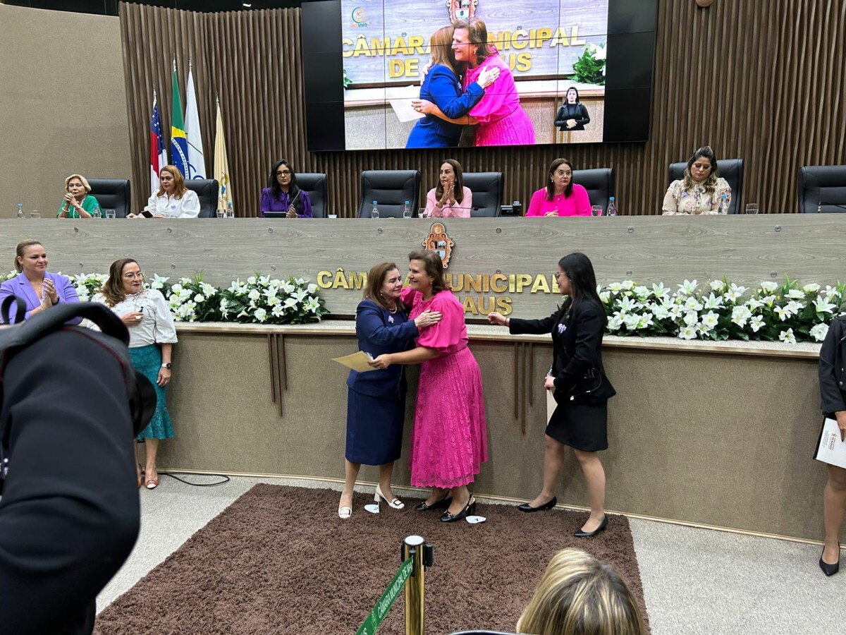 A sessão solene teve como objetivo homenagear todas as mulheres que lutam diariamente pelos seus direitos e pela igualdade de gênero, e destacar a importância de valorizar o papel da mulher na sociedade e reconhecer as suas conquistas. Entre as homenagens, a vereadora Yomara Lins homenageou sua mãe, acompanhada de sua filha e irmãs, e entregou o diploma de Honra ao Mérito para sua irmã, a Conselheira Yara Amazônia Lins Rodrigues dos Santos. “Mulher com seu jeito especial de ser, com seu exemplo de amor, perseverança e coragem, determinação e inteligência”, citou a vereadora para a irmã.