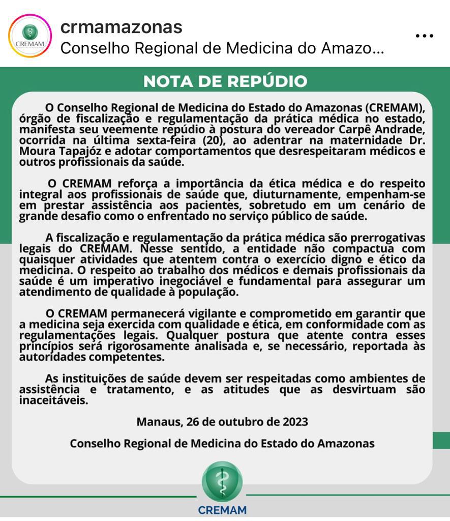 Brasil – O Conselho Regional de Medicina do Amazonas (Cremam) emitiu uma nota de repúdio nesta sexta-feira (27) condenando veementemente a conduta do vereador Carpê Andrade, do partido Republicanos, ocorrida há uma semana, quando o político adentrou na maternidade Dr. Moura Tapajóz, em Manaus.