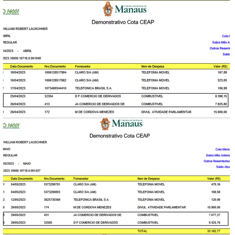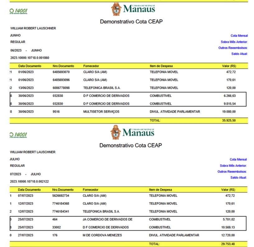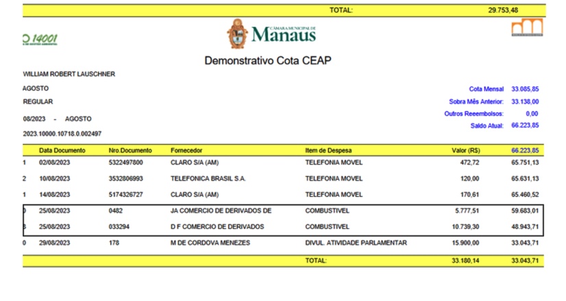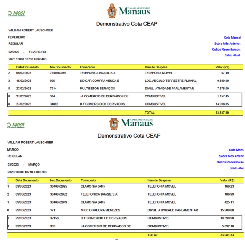 Em fevereiro, por exemplo, William despendeu R$33.517,99 da verba de gabinete, dos quais R$16.075,50 foram direcionados para o abastecimento dos veículos, correspondendo a 48% das despesas do gabinete, todas custeadas com recursos públicos.