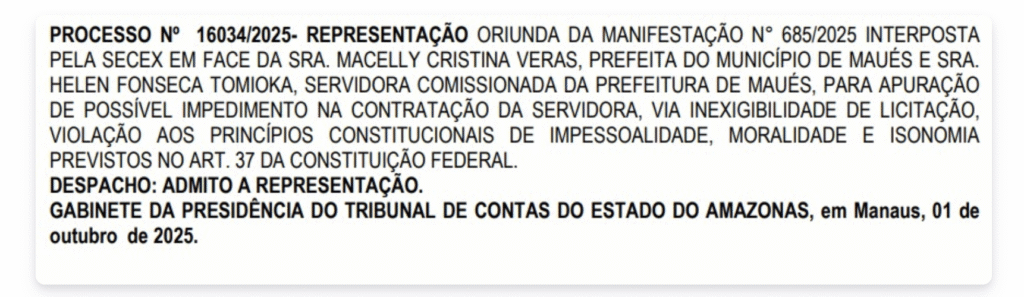 Segundo o despacho da Presidência do TCE-AM, a apuração tem como objetivo analisar se a contratação de Helen Tomioka pela Prefeitura de Maués, realizada por inexigibilidade de licitação, respeitou os princípios constitucionais da impessoalidade, moralidade e isonomia, conforme estabelece o artigo 37 da Constituição Federal.