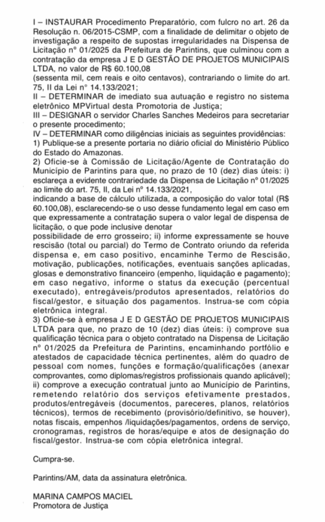 O MP-AM instaurou um Procedimento Preparatório e já solicitou à Prefeitura e à empresa a apresentação de documentos que comprovem não apenas a capacidade técnica, mas também a real execução dos serviços contratados.