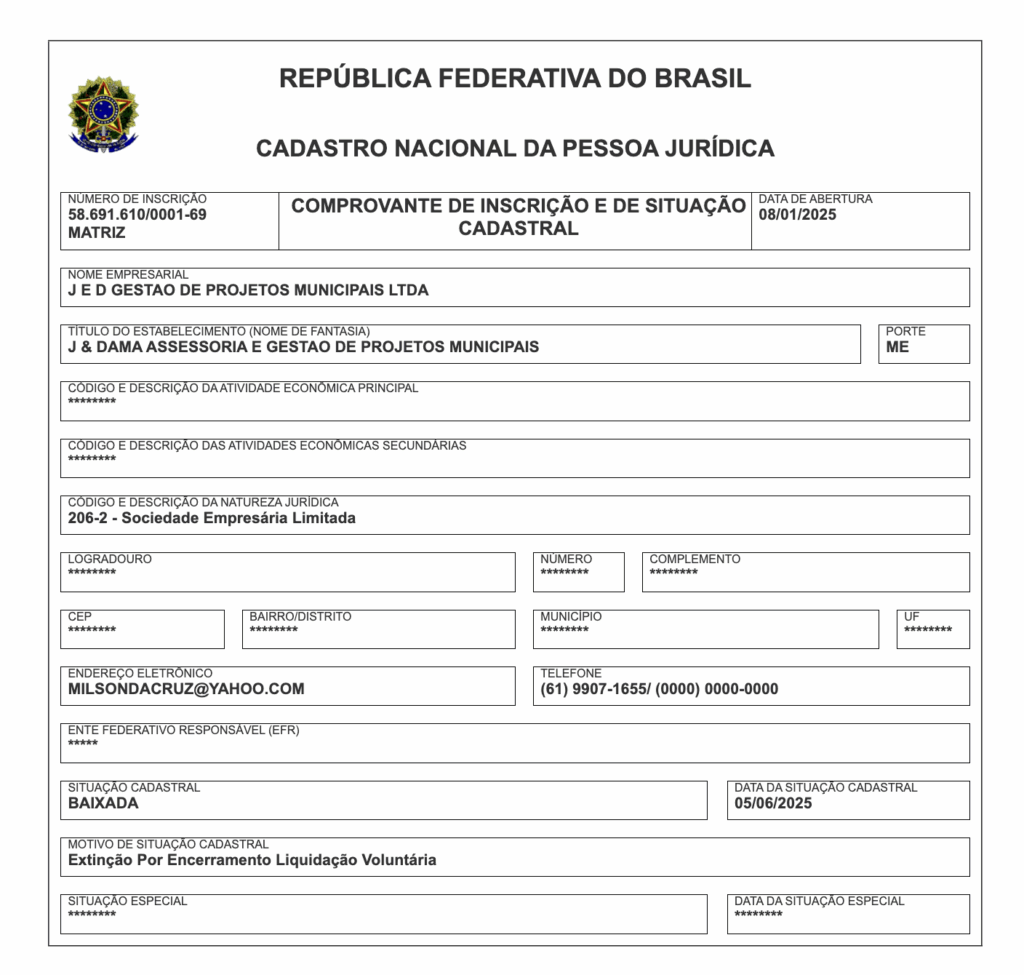 O detalhe é que o CNPJ foi aberto em 8 de janeiro de 2025 e, apenas quatro dias depois, já estava habilitada em um contrato por dispensa de licitação, modalidade que deveria ser usada em situações emergenciais e devidamente justificadas.