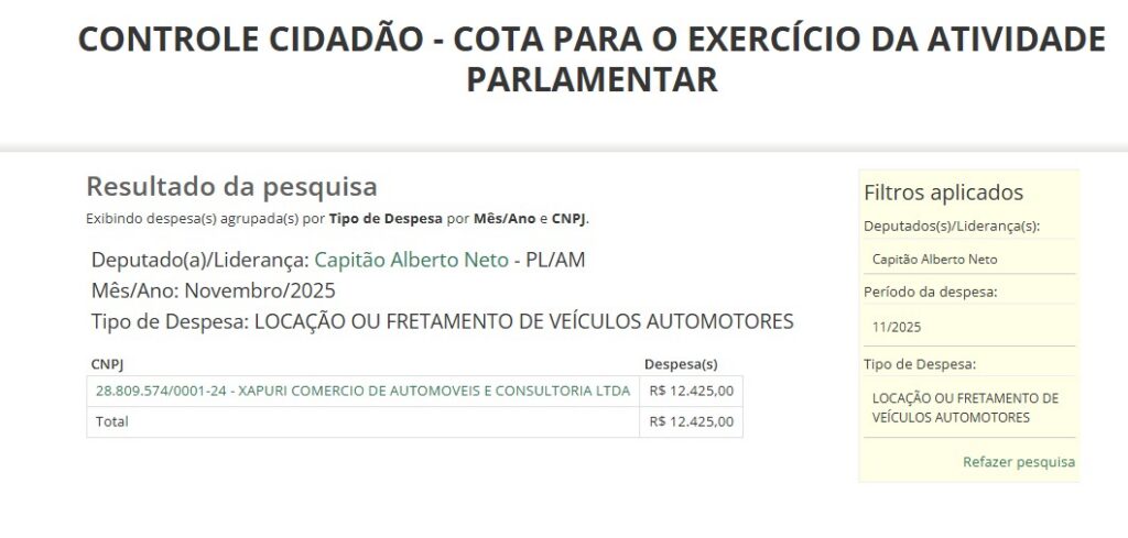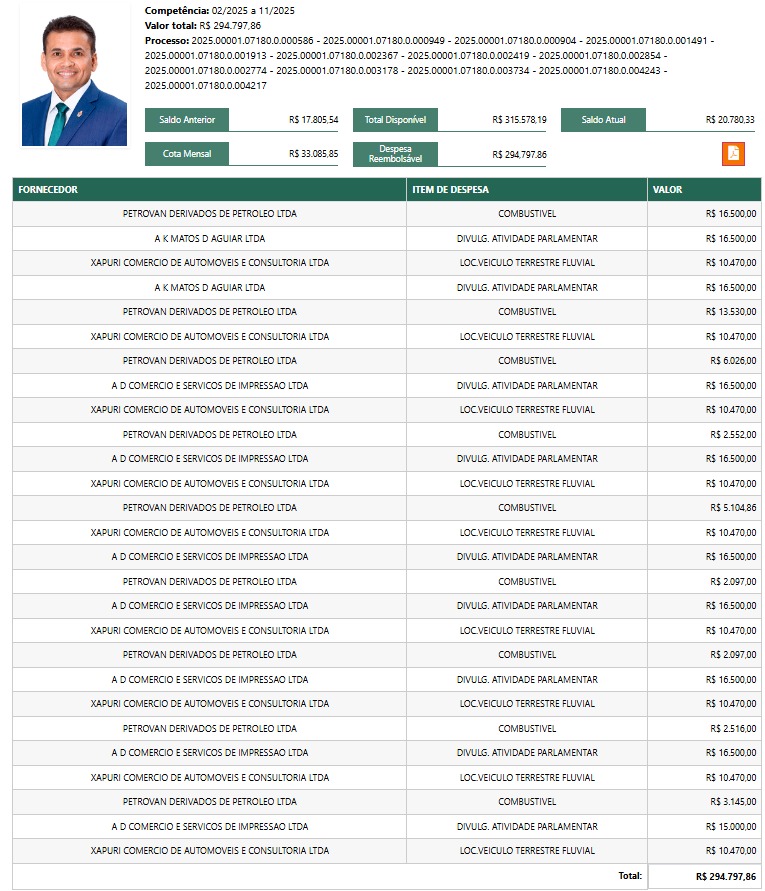 Dados oficiais da Câmara Municipal de Manaus mostram que, entre fevereiro e novembro de 2025, o parlamentar gastou R$ 94.230,00 em locação de veículos terrestres e fluviais com a empresa Xapuri Comércio de Automóveis e Consultoria Ltda, além de torrar outros R$ 53.976,86 em combustível com a Petrovan Derivados de Petróleo Ltda. Ao todo, quase R$ 300 mil da Cota para o Exercício da Atividade Parlamentar (CEAP) foram embora em deslocamentos e abastecimentos.