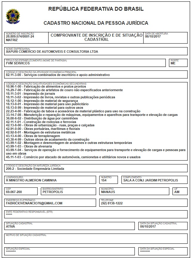 O que também chama atenção é o perfil da empresa: fundada em 2017 em Manaus, com nome fantasia FVM Serviços, sua atividade principal na Receita Federal é “serviços combinados de escritório e apoio administrativo”. Locação de veículos? Apenas uma das mais de 80 atividades secundárias declaradas, que incluem desde serviços gráficos até fabricação de alimentos. Uma verdadeira “empresa faz-tudo” – o tipo perfeito para contratos suspeitos com políticos.