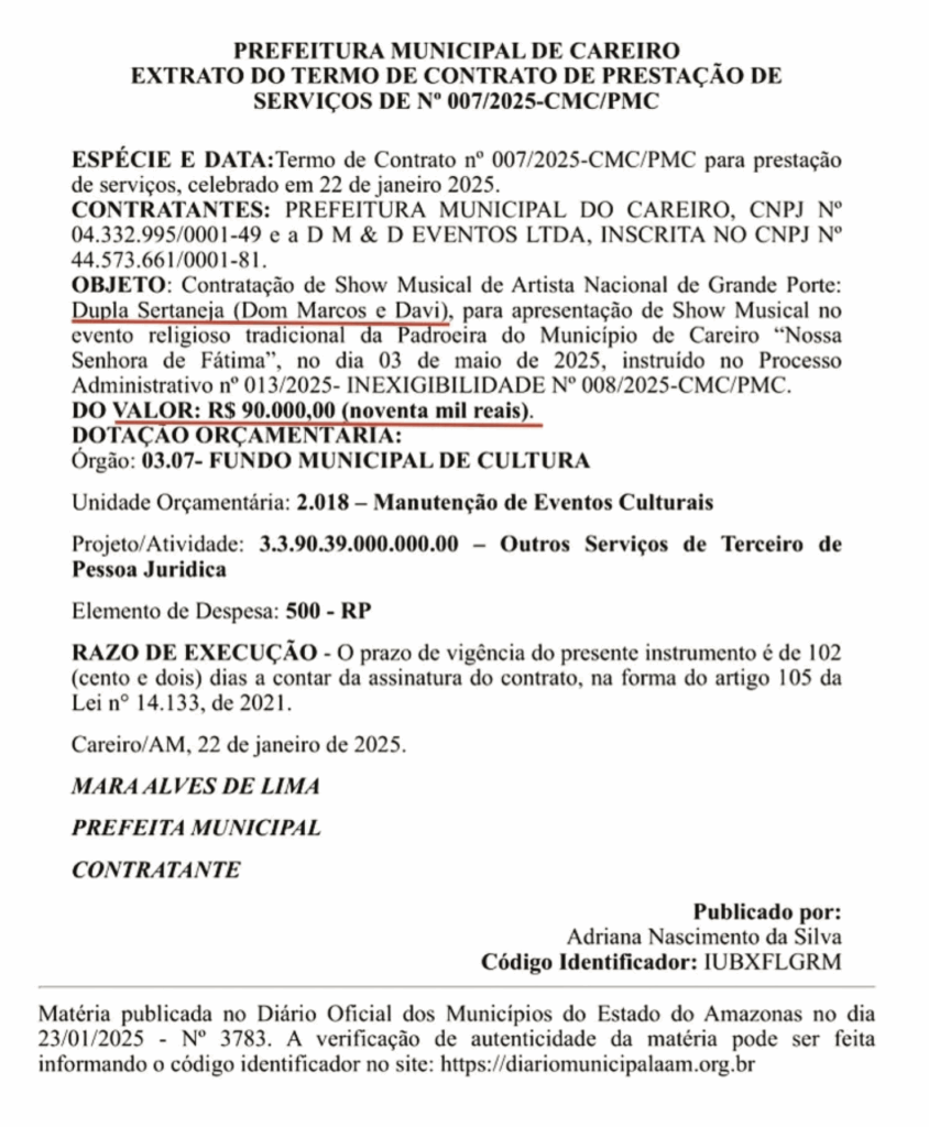 Enquanto crianças e famílias enfrentam essa dura realidade, a Prefeitura de Careiro Castanho já gastou R$ 630.000,00 (seiscentos e trinta mil reais) para contratar três atrações nacionais para a Festa da Padroeira “Nossa Senhora de Fátima” deste ano. Vitor Fernandes (R$ 280.000,00), Marília Tavares (R$ 260.000,00) e a dupla Dom Marcos e Davi (R$ 90.000,00) foram os artistas escolhidos para animar a festa, enquanto a população continua enfrentando uma verdadeira calamidade nas estradas.