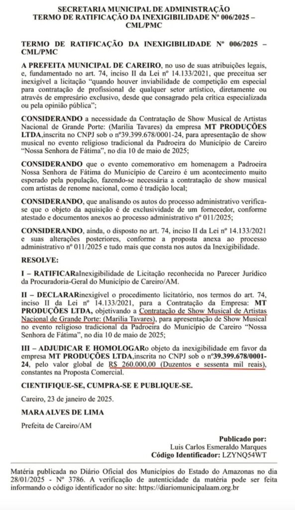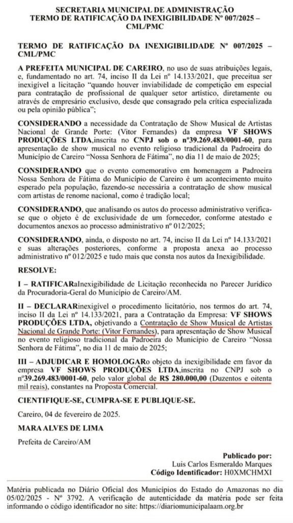 Em 2024, a prefeitura já foi alvo de críticas quando gastou R$ 400.000,00 com o show de Naiara Azevedo, que foi cancelado após intervenção da Defensoria Pública e do Ministério Público do Amazonas, mas liberado judicialmente após recurso. Mais uma vez, o foco da gestão parece ser o entretenimento, não a infraestrutura básica nem o futuro das crianças.
