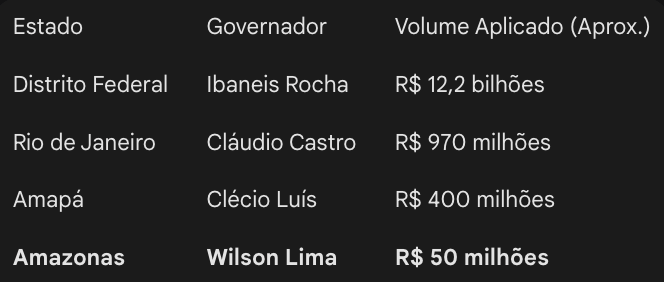 Enquanto o Distrito Federal lidera o volume de aplicações, a inclusão do Amazonas revela uma diretriz de investimento que priorizou ativos de alto risco e baixa reputação institucional. Além do Amazonas, também realizaram aplicações os governos do Distrito Federal, sob Ibaneis Rocha (MDB), com R$ 12,2 bilhões; do Rio de Janeiro, governado por Cláudio Castro (PL), com R$ 970 milhões; e do Amapá, sob Clécio Luís (Solidariedade), com R$ 400 milhões. O volume expressivo de recursos evidencia que a relação com o banco não se limitou a uma única gestão ou região do país.