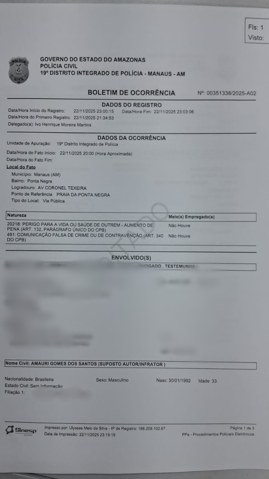 Manaus – O ex-vereador Amauri Gomes foi indiciado por dois crimes após o episódio que interrompeu o funcionamento da roda-gigante instalada na Ponta Negra, em Manaus. Ele foi indiciado pelo artigo 132 do Código Penal (perigo para a vida ou saúde de outrem) e pelo artigo 491 (comunicação falsa de crime). O indiciamento ocorre depois do transtorno provocado na noite de sábado (22), quando a estrutura elétrica do complexo foi violada, causando paralisação repentina do equipamento e pânico entre famílias presentes.