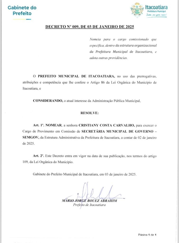 Logo no primeiro ato da nova gestão, Abrahim nomeou a esposa, Cristiany Costa Carvalho, como secretária municipal de Governo. O ato foi publicado no Diário Oficial em 2 de janeiro e assinado pelo próprio prefeito. O argumento oficial foi de que ela possuía “alta qualificação” — justificativa já contestada pelo Ministério Público de Contas (MPC-AM), que questionou a formação acadêmica da primeira-dama para exercer a função.