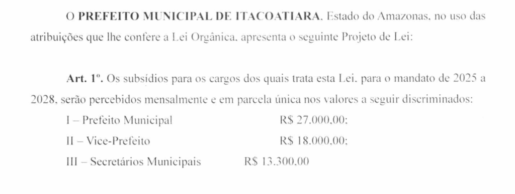 Confira na íntegra com os seguintes documentos: Lei-Organica-Compilada-pdf; Projeto-de-lei-de-aumento-salario-Itacoatiara;