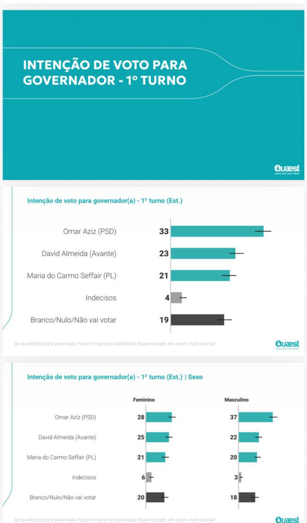 A pesquisa Quaest foi realizada entre os dias 5 e 11 de março, com 1.500 eleitores em todo o Amazonas. A margem de erro é de três pontos percentuais, para mais ou para menos, com nível de confiança de 95%. As entrevistas foram feitas presencialmente.