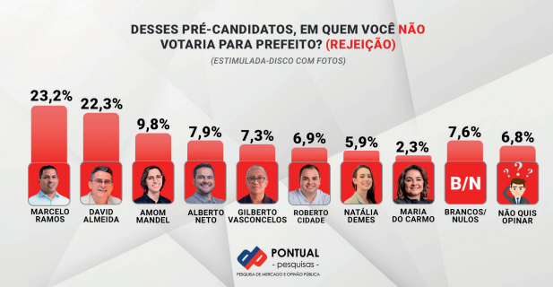 Além das intenções de voto, a pesquisa também mostrou os índices de rejeição dos pré-candidatos. Marcelo Ramos lidera com 23,2% de rejeição, seguido por David Almeida com 22,3%. Os demais índices de rejeição são: