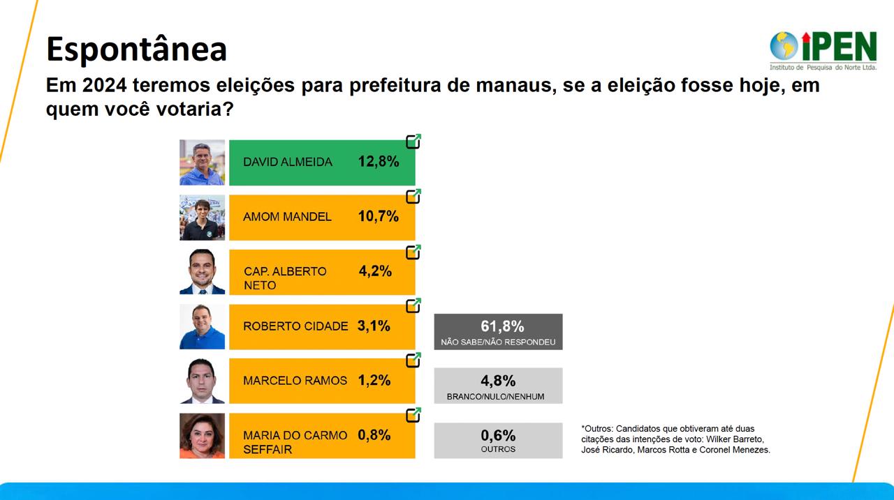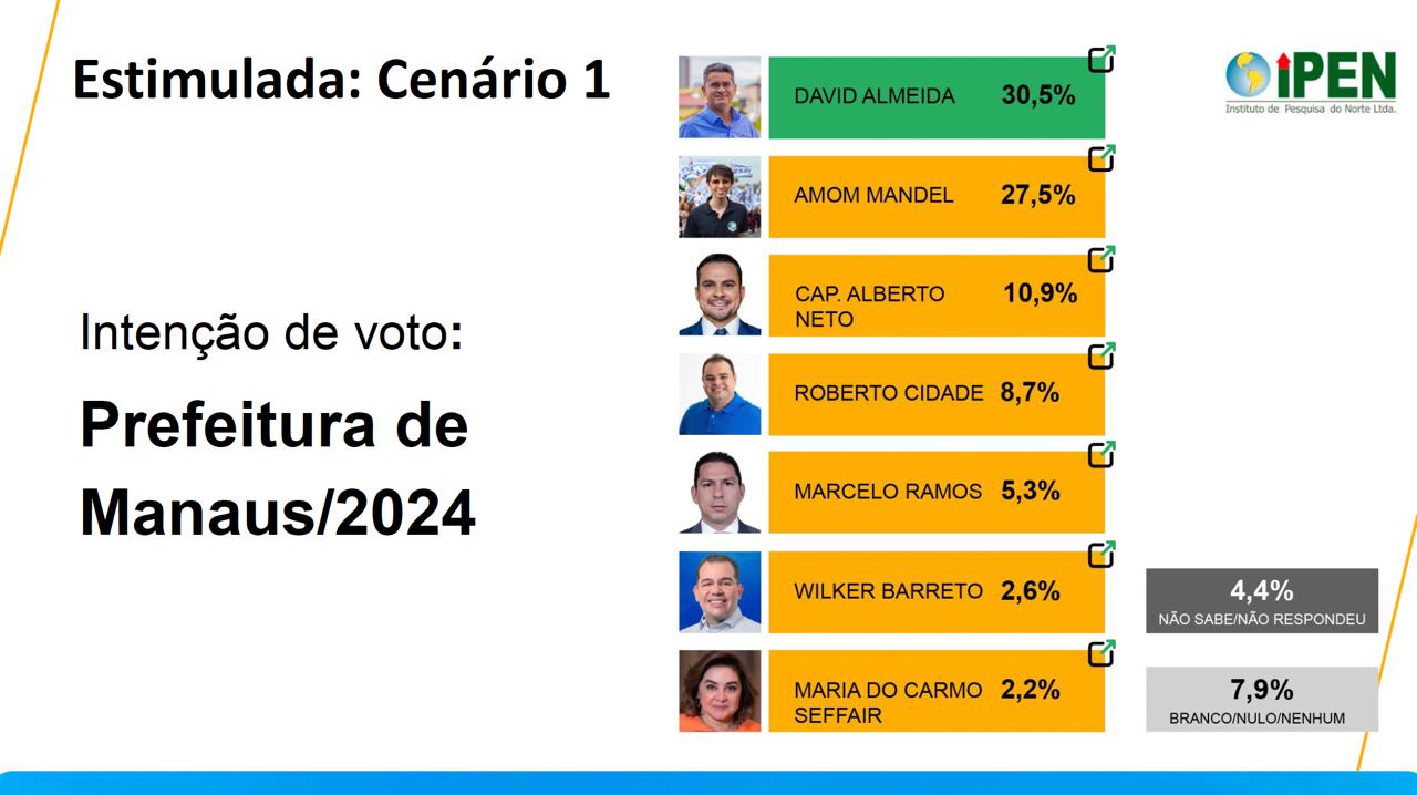 Manaus – O Instituto de Pesquisa IPEN, divulgou nesta quarta-feira (15) sua segunda pesquisa em parceria com outros seis sites de notícia de Manaus. David Almeida (Avante) está em primeiro com 30,5% seguido de Amom Mandel (Cidadania) com 27,5%, Cap. Alberto Neto (PL) com 10,9%, Roberto Cidade com 8,7%, Marcelo Ramos com 5,3%, Wilker Barreto com 2,6% e Maria do Carmo com 2,2%.
