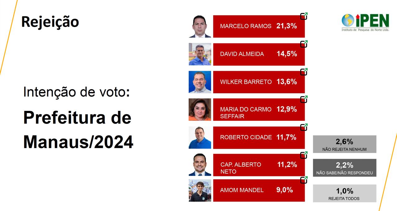 Apesar de não constar na pesquisa de abril realizado pelo IPEN, Marcelo Ramos estreia na liderança da rejeição entre o eleitorado consultado, alcançando o índice de 21,3%.