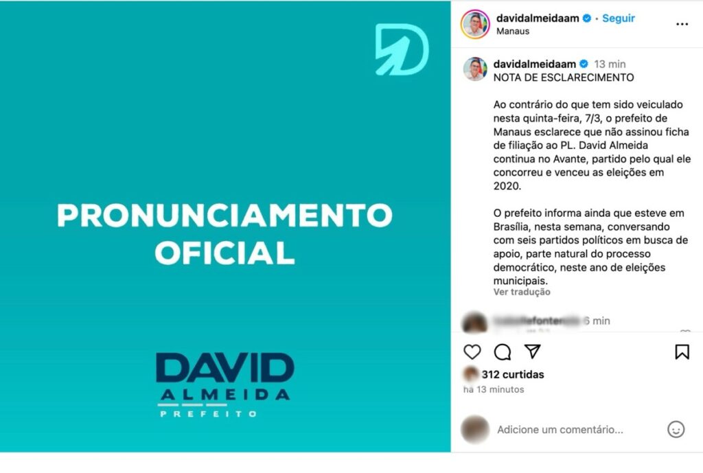 Manaus – Em uma nota de esclarecimento emitida nesta quinta-feira (7/3), o prefeito de Manaus, David Almeida, desmentiu veementemente as informações divulgadas pelo comunicador Jefferson Coronel. Contrariando os rumores, Almeida afirmou categoricamente que não assinou ficha de filiação ao Partido Liberal (PL) e que continua fiel ao Avante, partido pelo qual foi eleito em 2020.