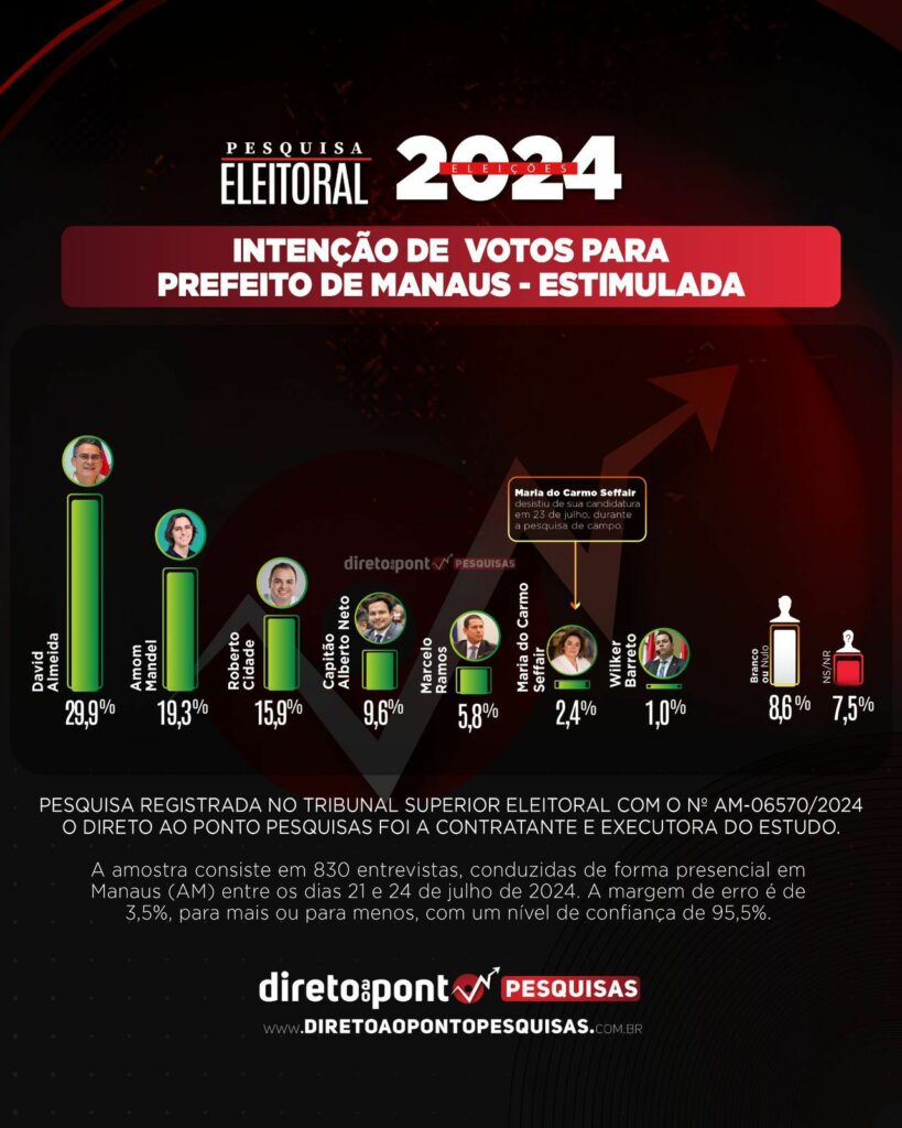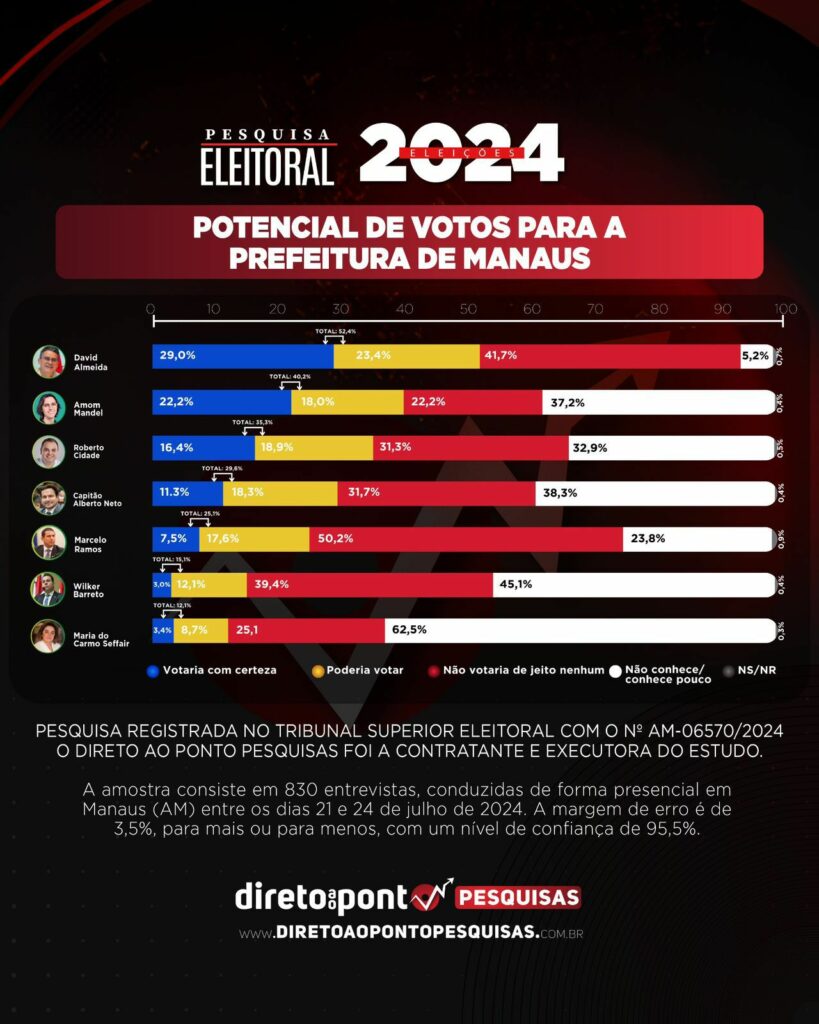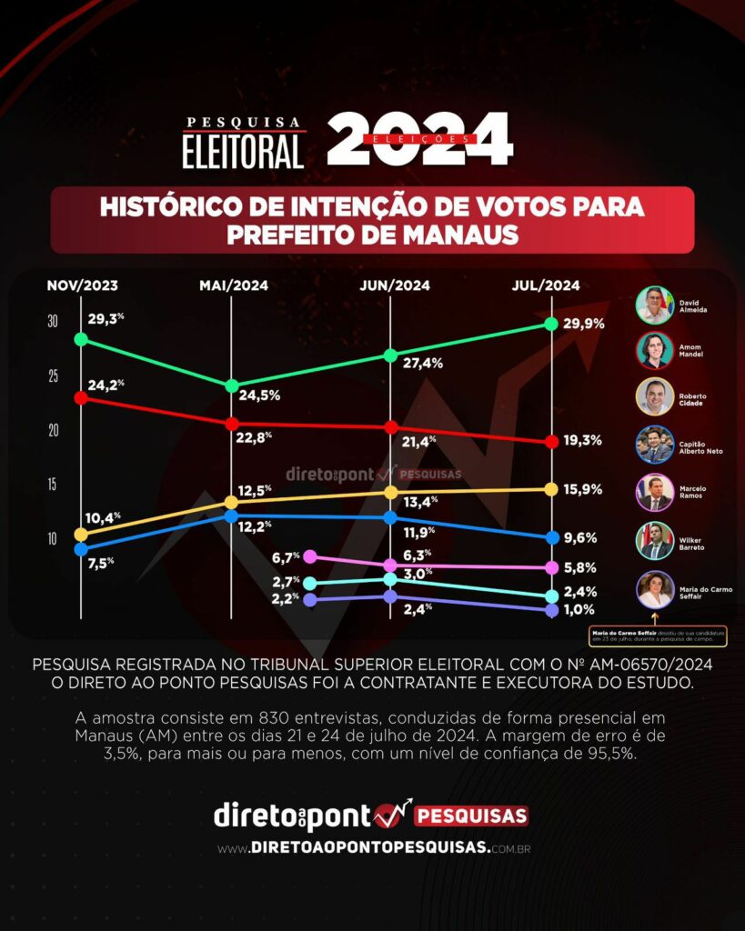 A amostra consultou 830 eleitores de 21 e 24 de julho e tem margem de erro de 3,5%. Registrada no TRE sob o número AM-06570/2024.