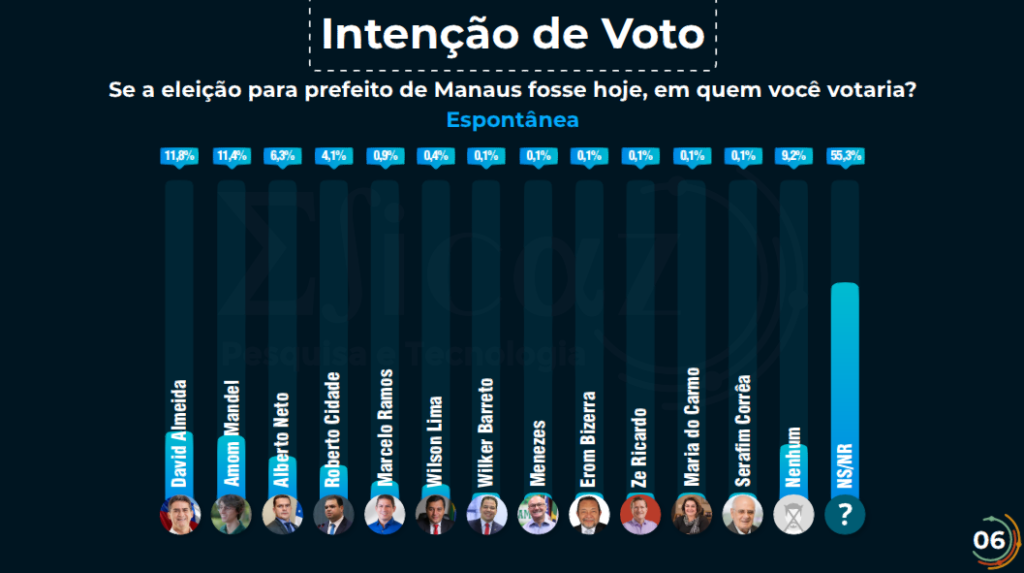 Outros candidatos também foram avaliados. O pré-candidato Capitão Alberto Neto ocupa a terceira posição com 15,5% das intenções de voto, seguido por Roberto Cidade com 8% e Marcelo Ramos com 4,1%. Votos brancos e nulos somam 8,6%, enquanto 6,5% dos entrevistados ainda estão indecisos.