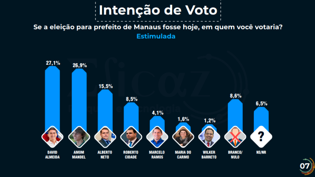 Manaus – O prefeito de Manaus, David Almeida, lidera a intenção de votos para a eleição municipal, conforme aponta uma pesquisa realizada pela Eficaz Pesquisa e Tecnologia. Os dados, divulgados nesta sexta-feira, 17 de maio, mostram que Almeida, candidato à reeleição, tem 27,1% das intenções de voto, enquanto o deputado federal Amom Mandel aparece logo em seguida, com 26,9%, configurando um empate técnico entre os dois candidatos.