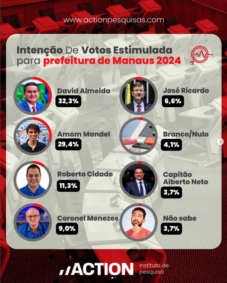 Na resposta estimulada, que apresenta os nomes dos pré-candidatos, as posições se mantiveram, mas com variações significativas nas porcentagens. David Almeida alcançou 32,3%, Amom Mandel ficou com 29,4%, e Roberto Cidade, que entrou recentemente na disputa, registrou 11,3%.