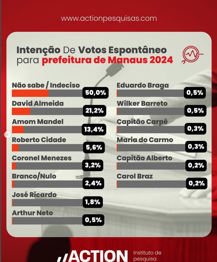 Os resultados da pergunta espontânea revelam um cenário marcado pela indecisão, com 50% dos entrevistados ainda não associados a nenhum candidato específico. Os três primeiros colocados nessa modalidade foram o atual prefeito David Almeida, com 21,2%, seguido pelo deputado federal Amom Mandel, com 13,4%, e o deputado estadual Roberto Cidade, com 5,7%.