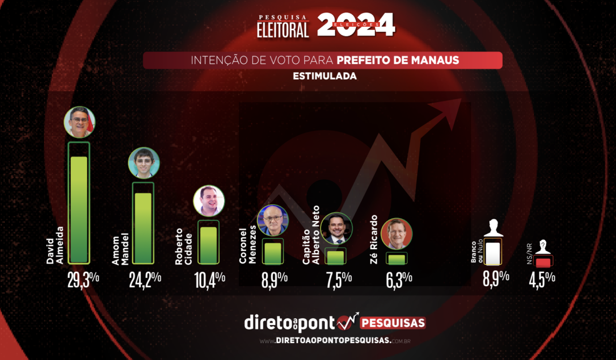 David Almeida lidera com 29,3%, consolidando sua posição como o favorito até o momento. Já o deputado federal Amom Mandel aparece como o segundo colocado, com 24,2% das intenções de voto, seguido pelo presidente da Assembleia Legislativa do Amazonas, Roberto Cidade, que registra 10,4% das intenções de voto.