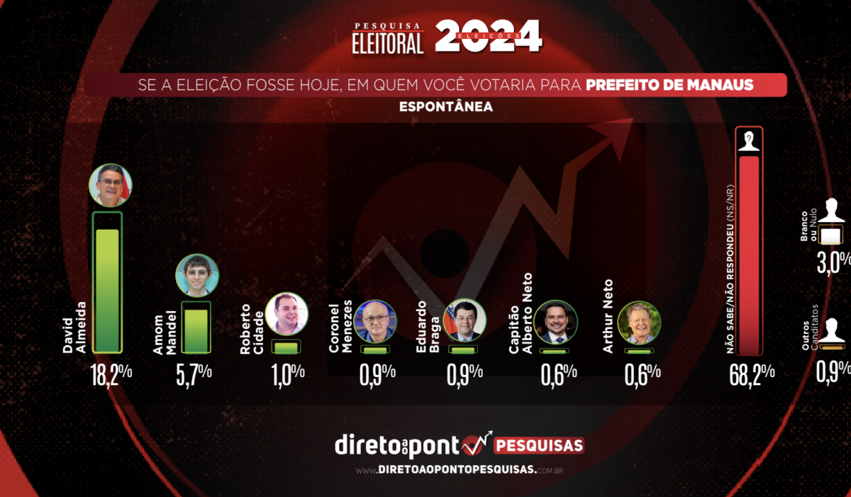 No cenário de pesquisa espontânea, David Almeida mantém sua liderança com 18,2%. Amom Mandel surge com 5,7%, e Roberto Cidade com 1,0%. Nomes como Coronel Menezes, Eduardo Braga (MDB), Capitão Alberto Neto e Arthur Neto (sem partido) aparecem abaixo de 1%. Outros nomes, brancos e nulos somam 3,9%.