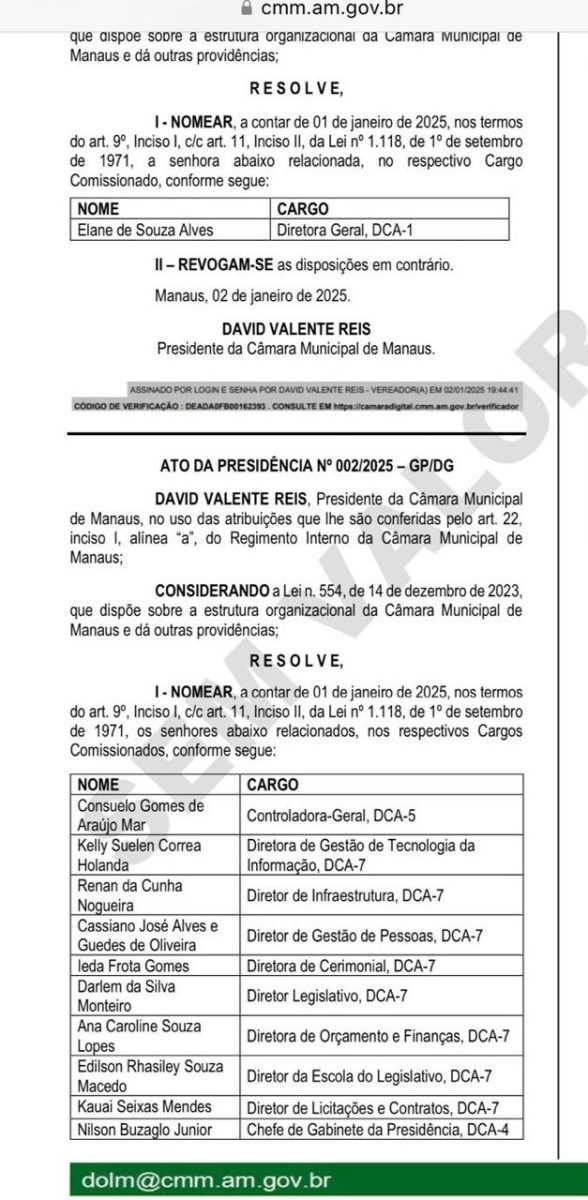 Manaus — O presidente da Câmara Municipal de Manaus (CMM), vereador David Reis (Avante), oficializou, no Diário Oficial desta quinta-feira (2/1), as primeiras nomeações de sua gestão, abrangendo cargos estratégicos no Legislativo Municipal. As designações entraram em vigor no dia 1º de janeiro de 2025.