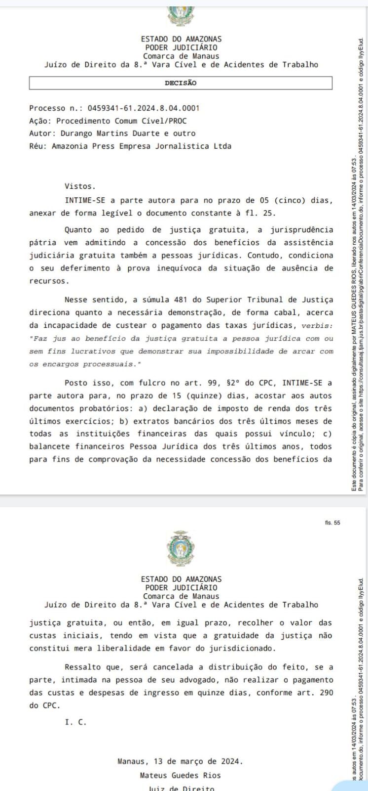 Inicialmente, a Justiça de primeira instância negou o pedido de Duarte para remover a matéria, que alegava que a empresa dele de publicidade, a iMarketing, havia sido ‘presenteada’ com licitações públicas que somavam R$ 25 milhões. Insatisfeito, Duarte recorreu, solicitando a revisão da sentença e o deferimento da justiça gratuita, alegando não ter condições financeiras para arcar com as custas processuais.