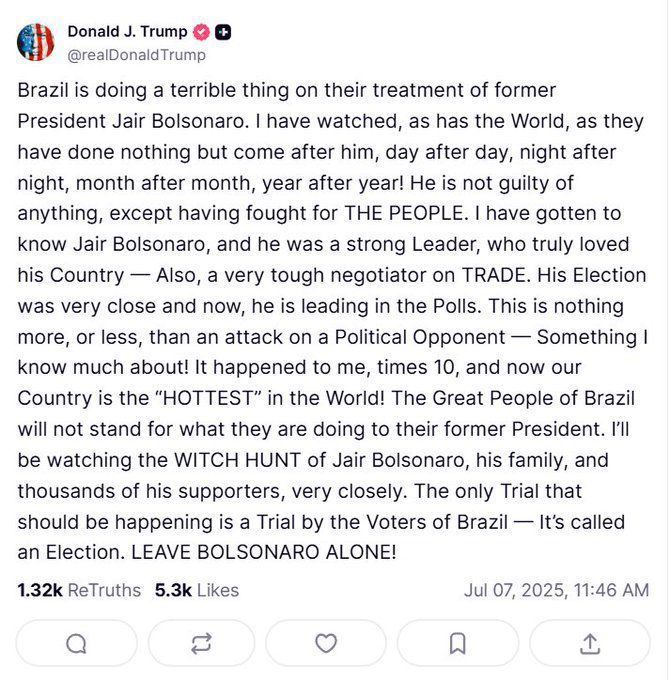 Mundo – Em uma postagem explosiva feita nesta segunda-feira (7), o presidente dos Estados Unidos, Donald J. Trump, saiu em defesa do ex-presidente Jair Bolsonaro e não economizou nas palavras para criticar o tratamento que o Brasil tem dado ao líder conservador brasileiro.