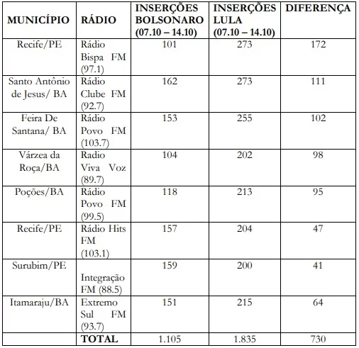 No relatório, a campanha do presidente afirma que foi utilizada “uma pequena amostragem de oito rádios” para apontar “discrepância de 730 inserções, em desfavor da campanha do candidato peticionário”. Como cada inserção tem 30 segundos, as 730 propagandas citadas confeririam pouco mais de seis horas de vantagem do candidato petista nas rádios mencionadas.